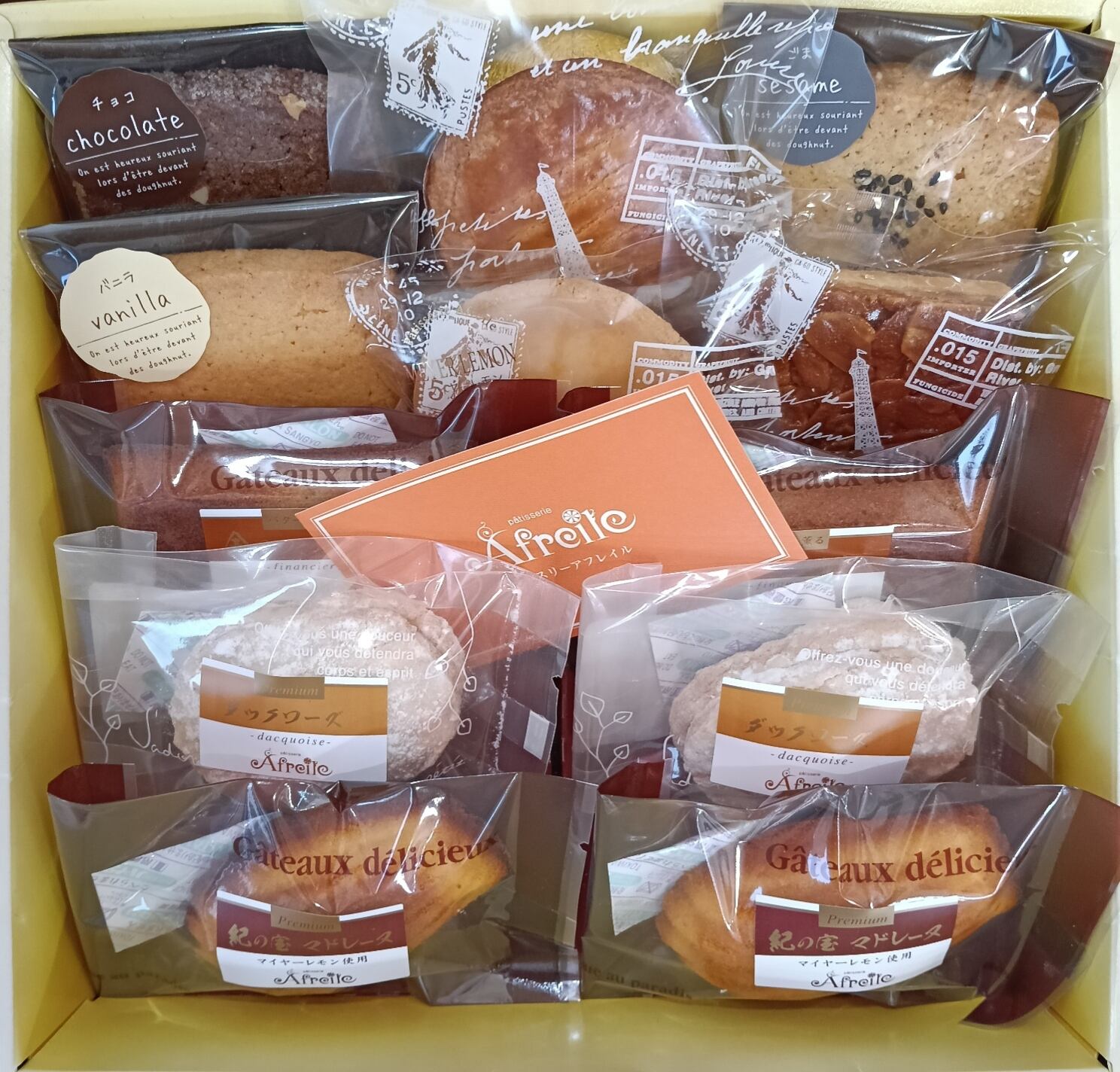 紀の宝マドレーヌ2個、フィナンシェ2個、ダックワーズ2個、